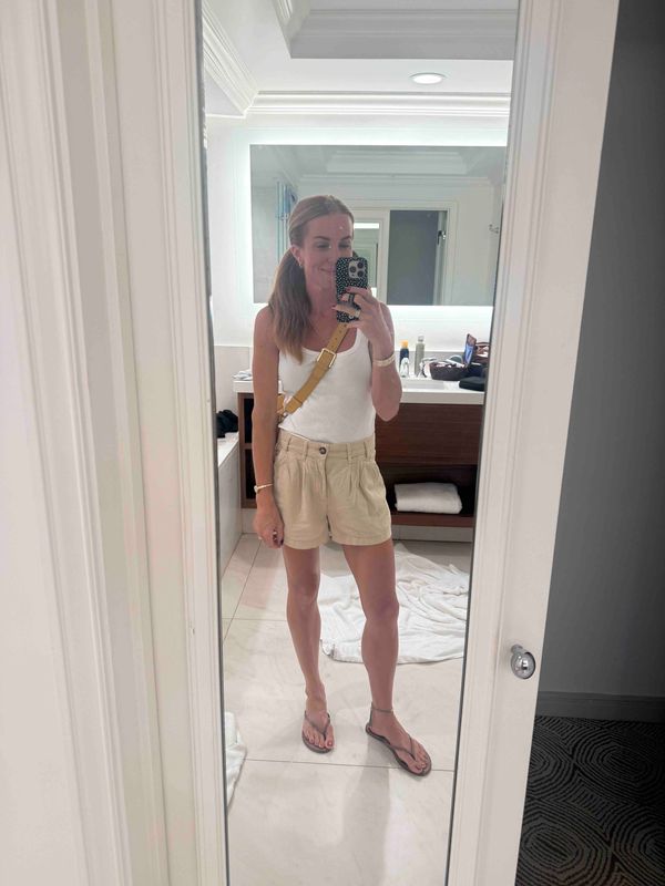 You know I love a good green and this sweater is BEAUTIFUL. It has a bit of a shimmer to it too, which is fun. It’s oversized, I’m wearing my true size. The skirt is SO CUTE and will be on repeat all season long. Love the pleats that it has and the movement in it is so good. Wearing my true size. I will wear this so much this season.