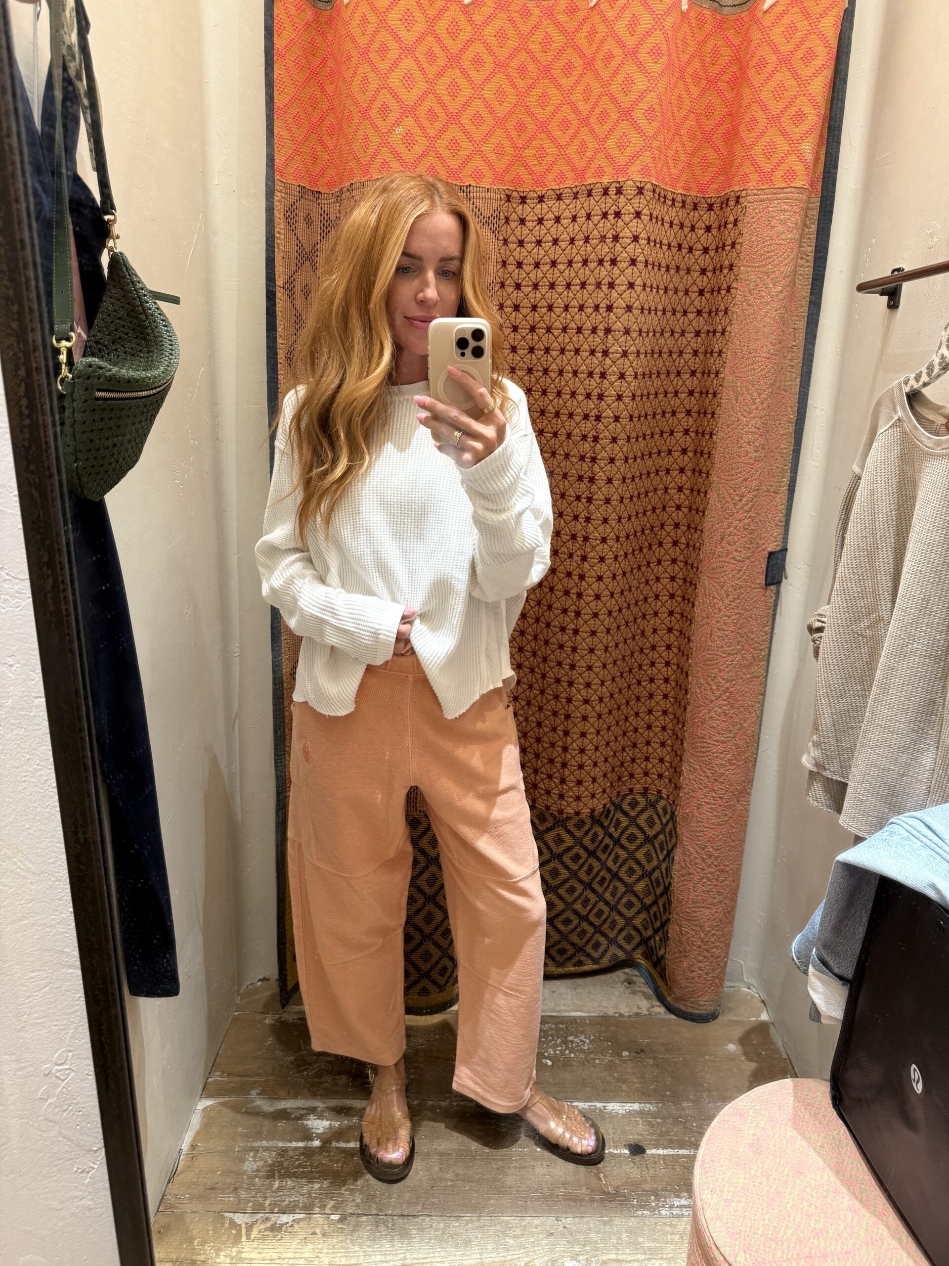 Wearing an XS in the shirt, which is what i normally am in FP tops. It’s a waffle material and I have a few of them. Such a good basic.